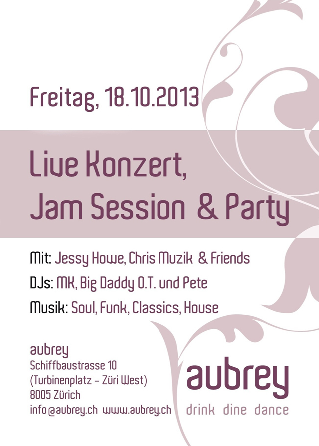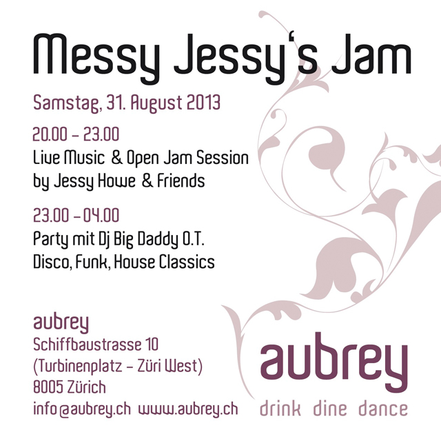 Am Fr., 18. Oktober “Messy Jessy’s Jam” spielt am 5-jährigen Jubiläum vom Resti/Bar/Club Aubrey in Zürich. Live Konzert mit Open Jam Session für alle MusikerInnen, SängerInnen und FreundInnen von Live Musik. Backline steht, brint Eure Gitarren, Bässe, Blasinstrumente mit..